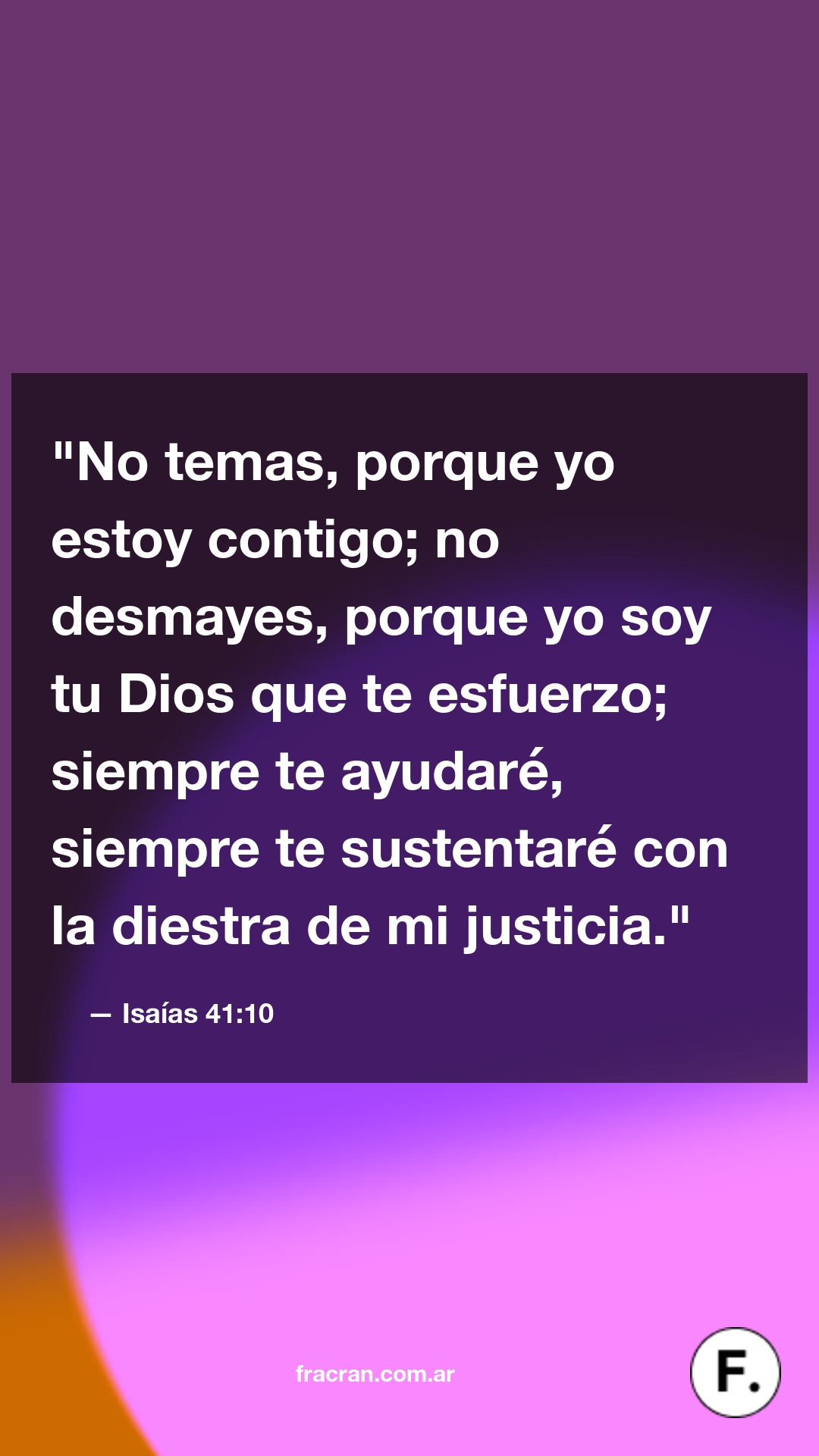 "No temas, porque yo estoy contigo; no desmayes, porque yo soy tu Dios que te esfuerzo; siempre te ayudaré, siempre te sustentaré con la diestra de mi justicia."