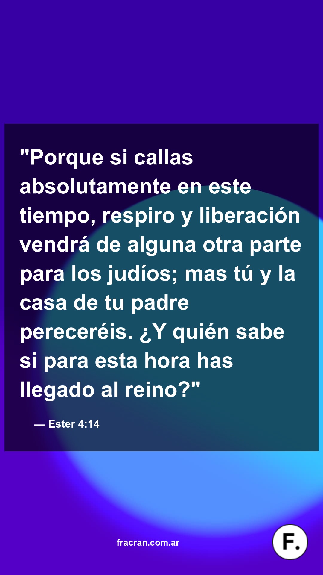 "Porque si callas absolutamente en este tiempo, respiro y liberación vendrá de alguna otra parte para los judíos; mas tú y la casa de tu padre pereceréis. ¿Y quién sabe si para esta hora has llegado al reino?"