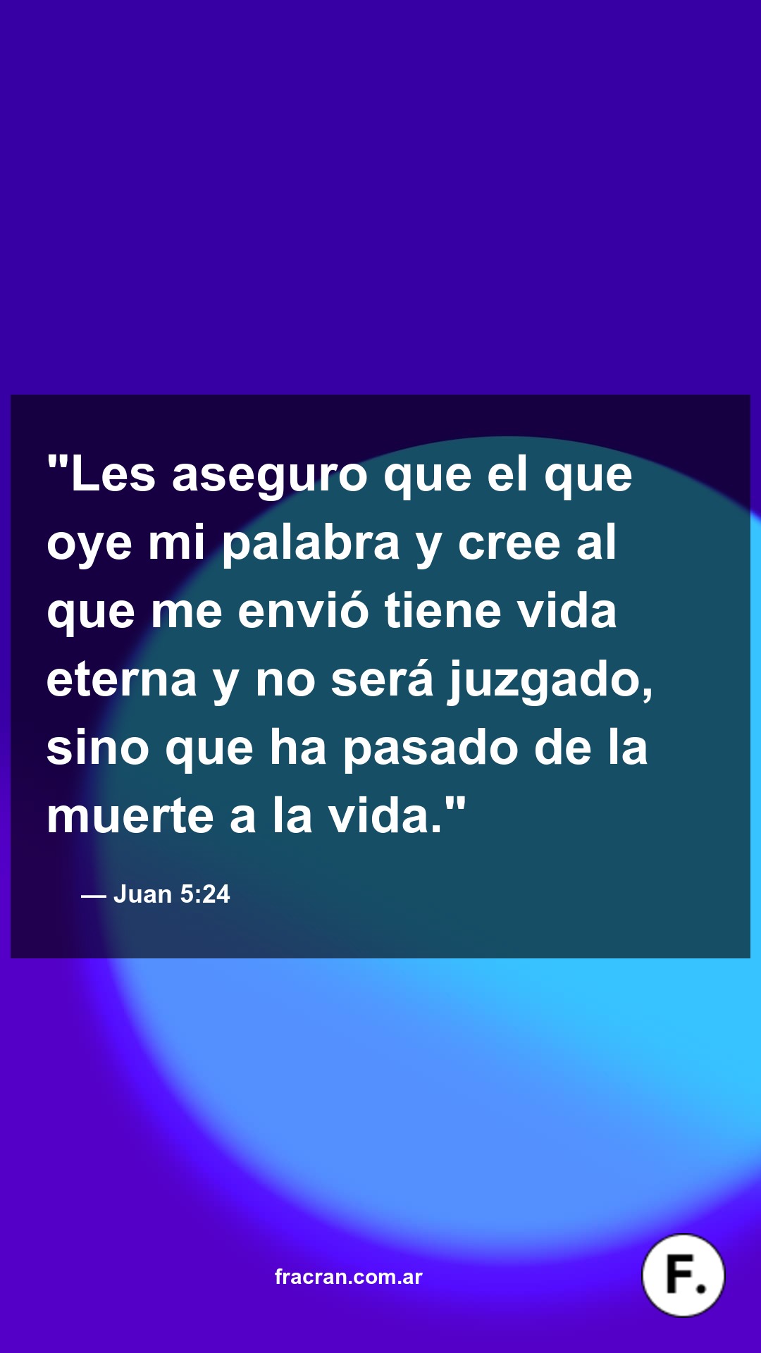 »Les aseguro que el que oye mi palabra y cree al que me envió tiene vida eterna y no será juzgado, sino que ha pasado de la muerte a la vida.