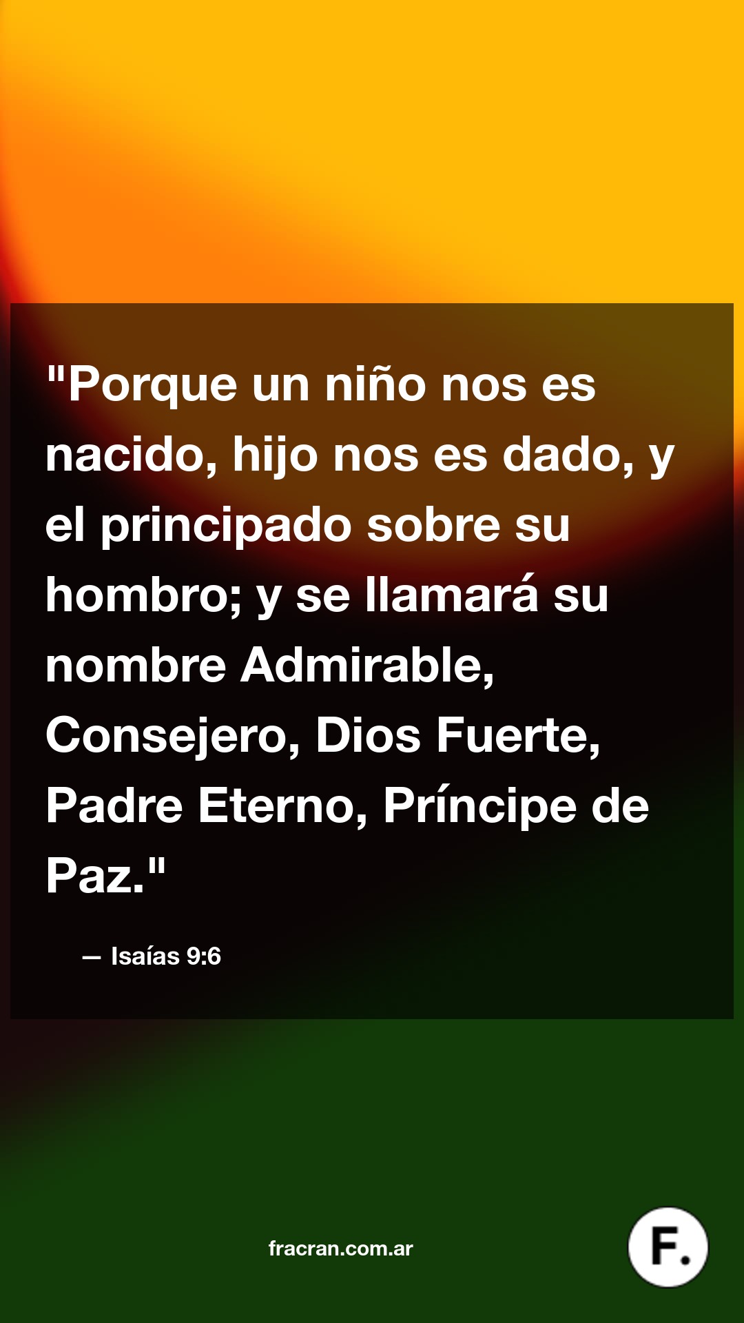Porque un niño nos es nacido, hijo nos es dado, y el principado sobre su hombro; y se llamará su nombre Admirable, Consejero, Dios Fuerte, Padre Eterno, Príncipe de Paz.