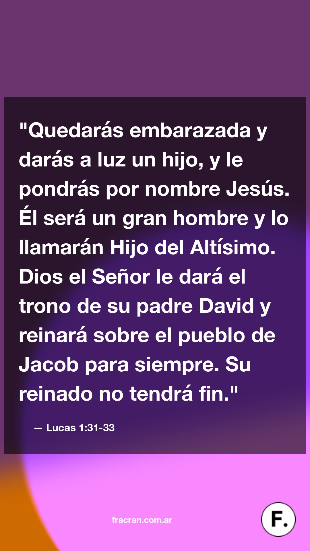 Quedarás embarazada y darás a luz un hijo, y le pondrás por nombre Jesús. Él será un gran hombre y lo llamarán Hijo del Altísimo. Dios el Señor le dará el trono de su padre David y reinará sobre el pueblo de Jacob para siempre. Su reinado no tendrá fin.