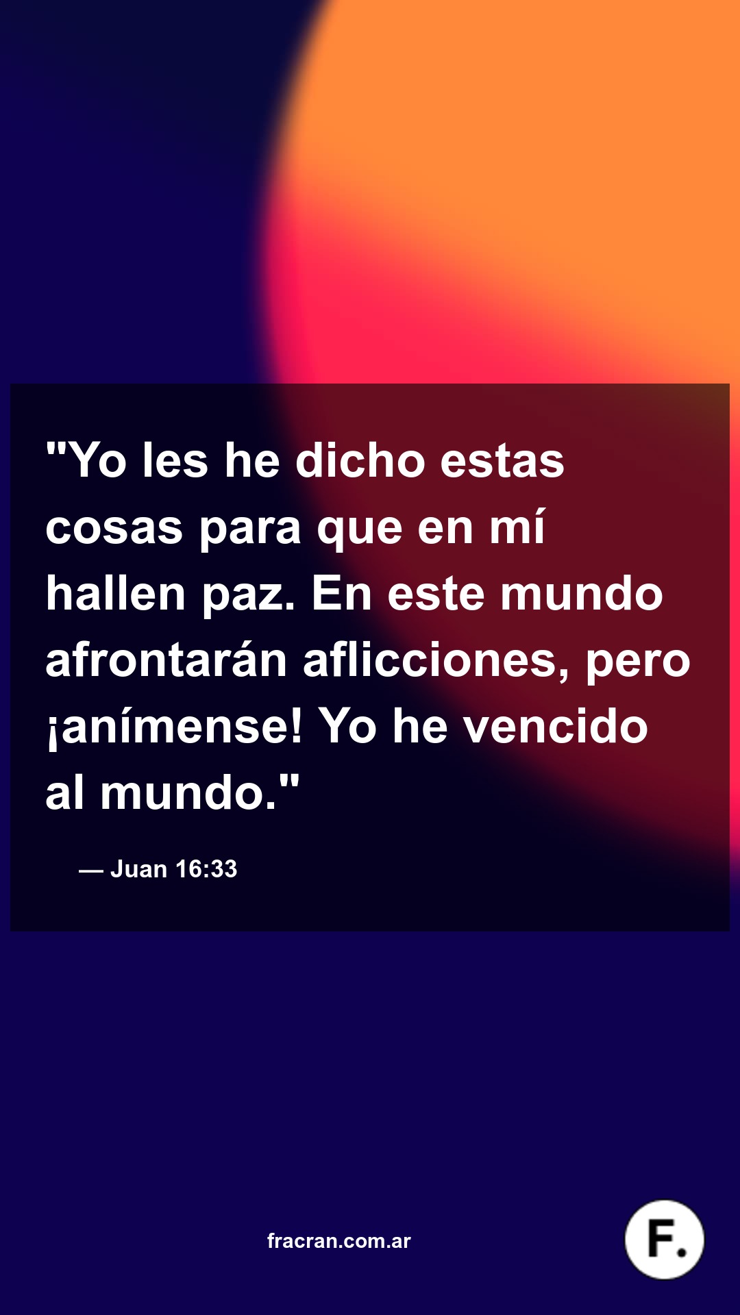 "Yo les he dicho estas cosas para que en mí hallen paz. En este mundo afrontarán aflicciones, pero ¡anímense! Yo he vencido al mundo."